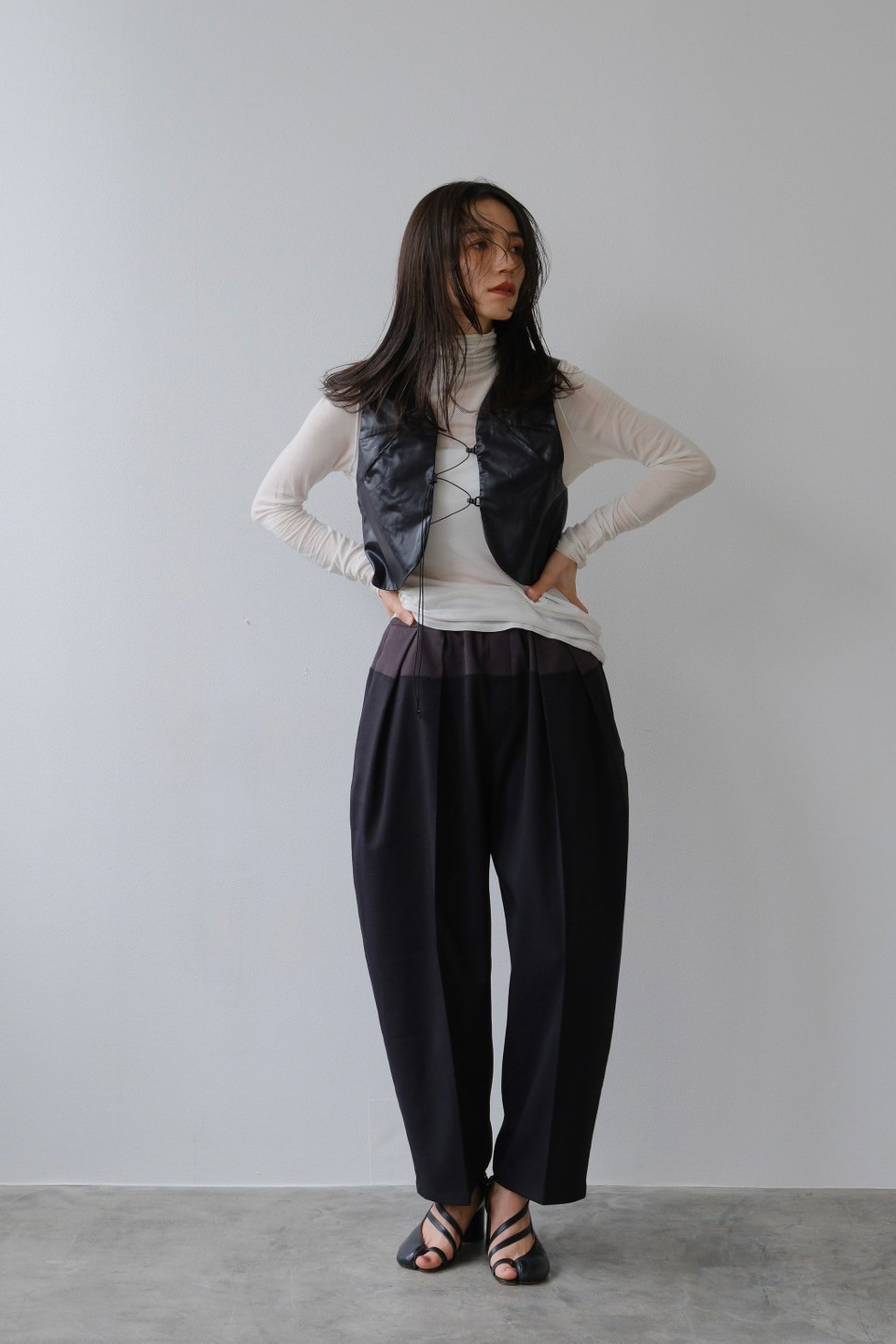 ゆるすぎない絶妙なバランスで、きちんと感と動きやすさを実現。さらに、ウエスト部分をバイカラー配色で切り替え、視線を上に引き上げることでデザイン性をプラスしつつも脚長効果も期待できます。