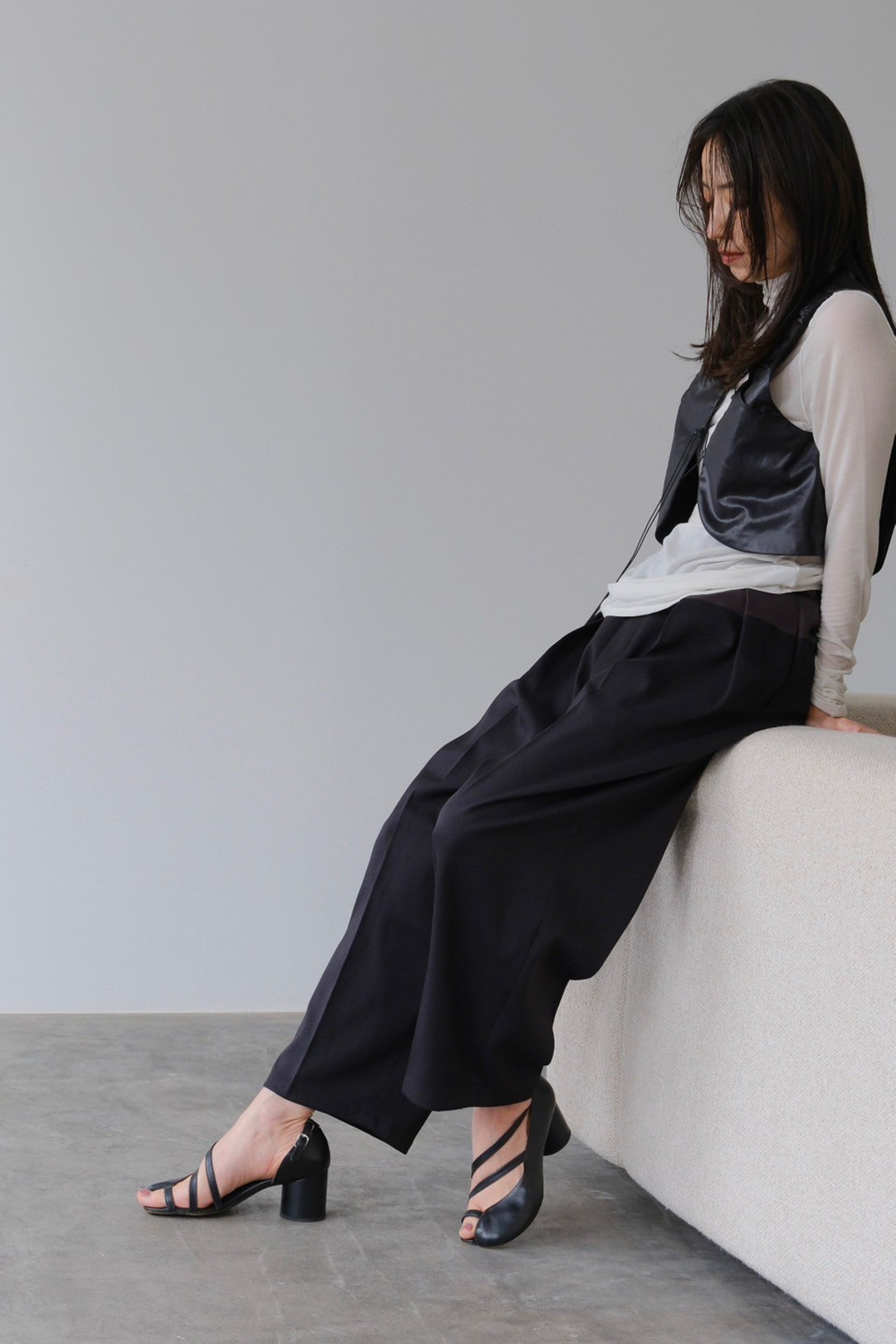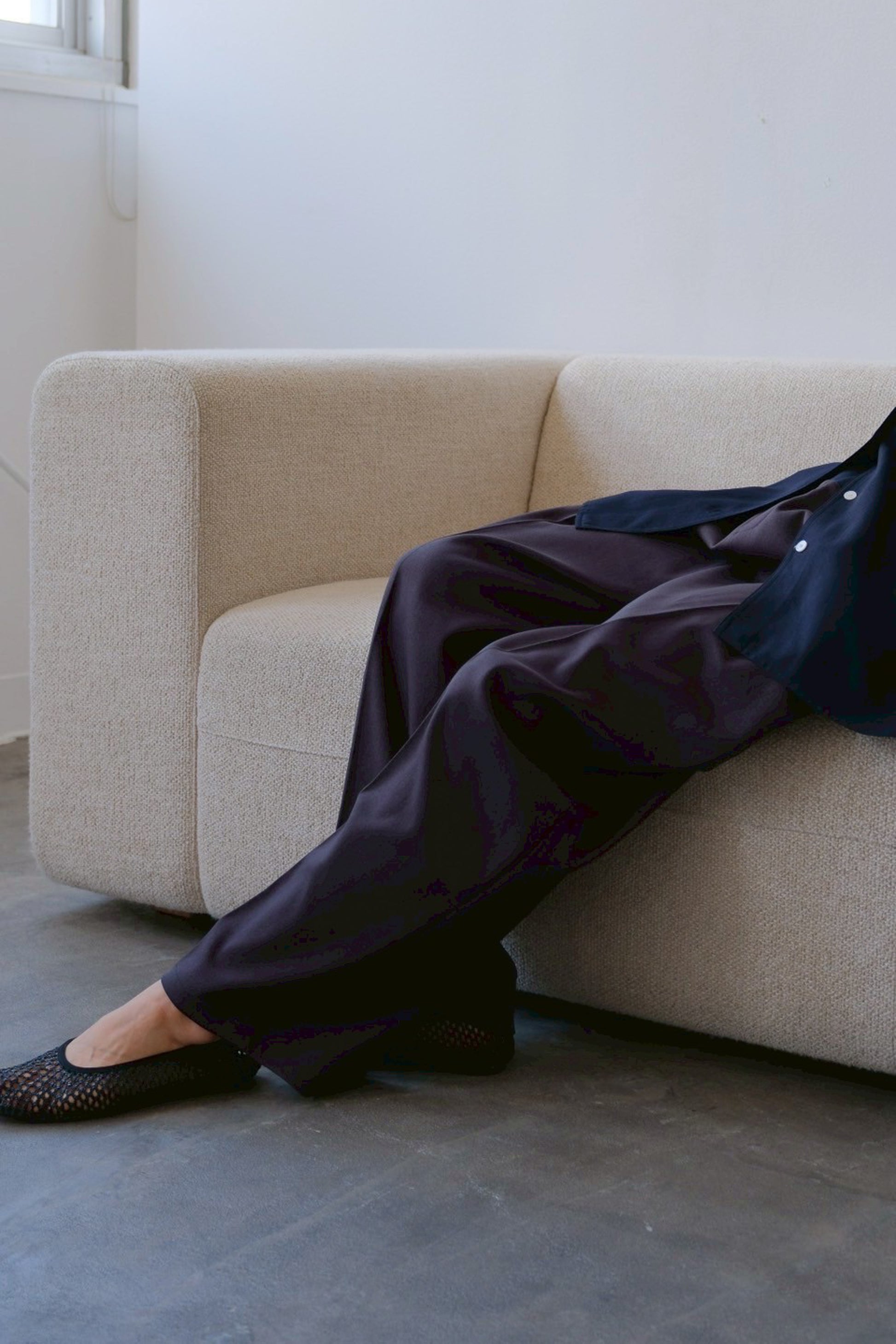 モード感漂うカーブシルエットとツータック構造、そしてセンタープレスによる縦のラインが、脚をすらりと見せる洗練されたフォルムをつくり出します。