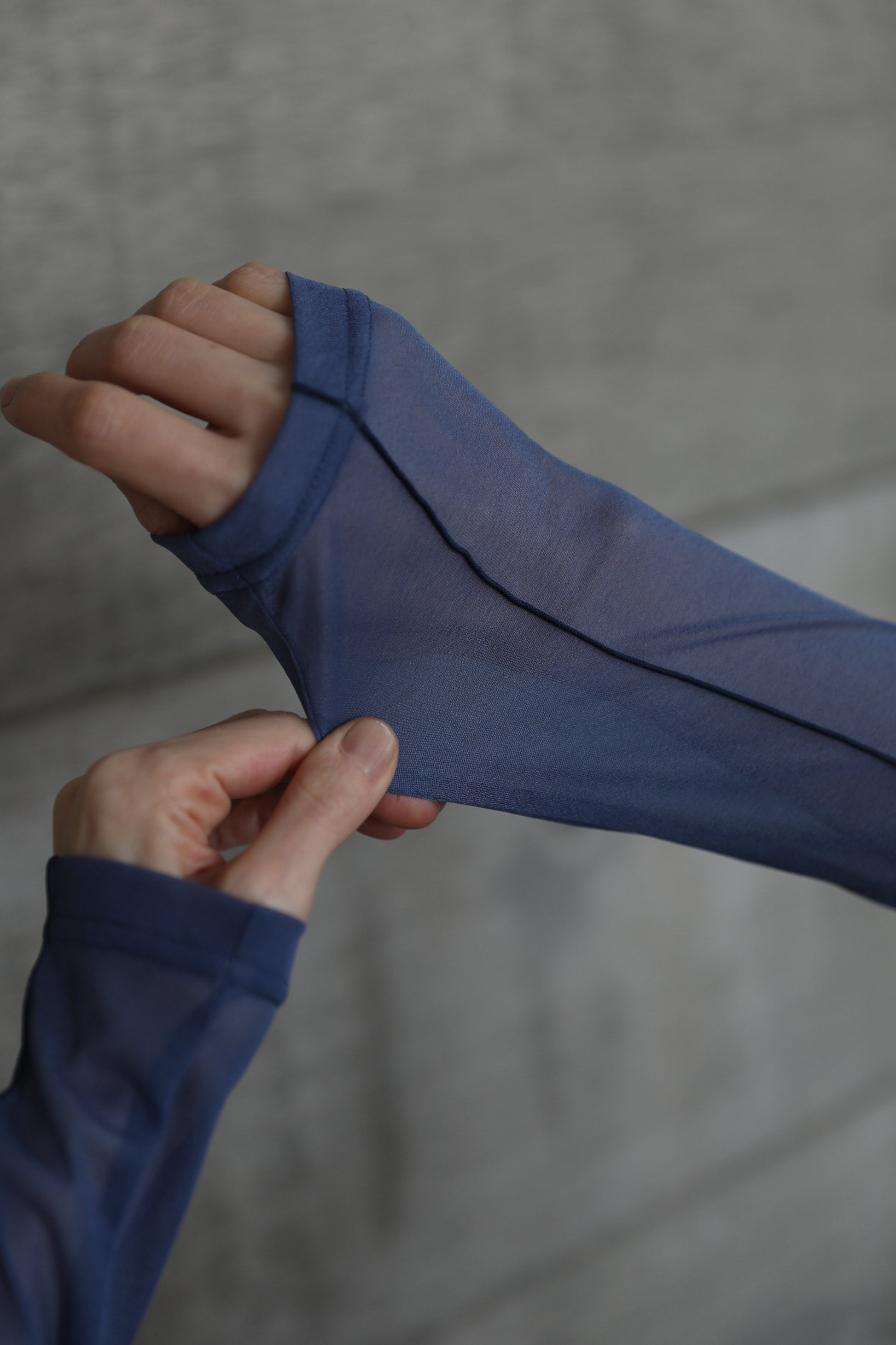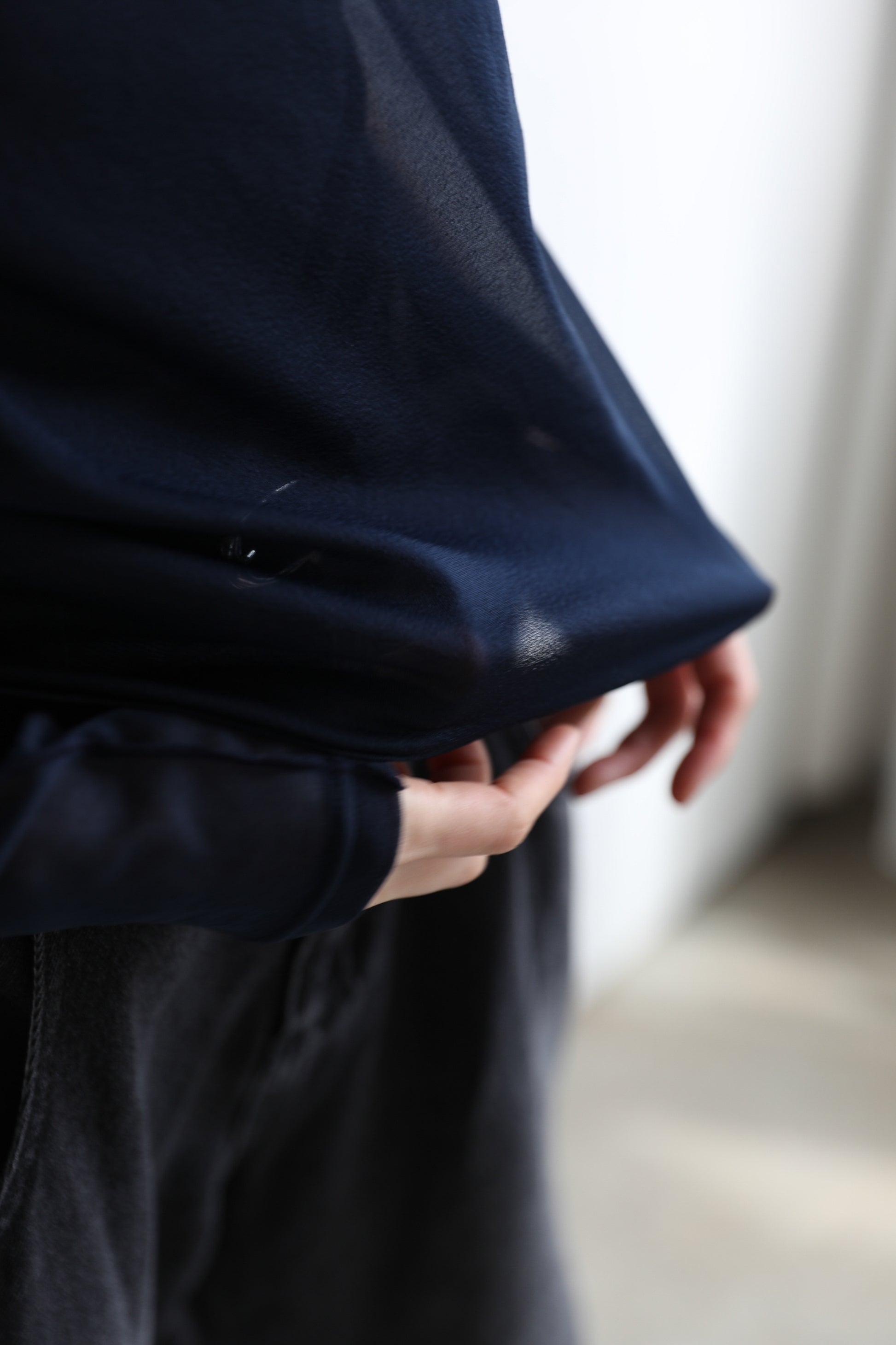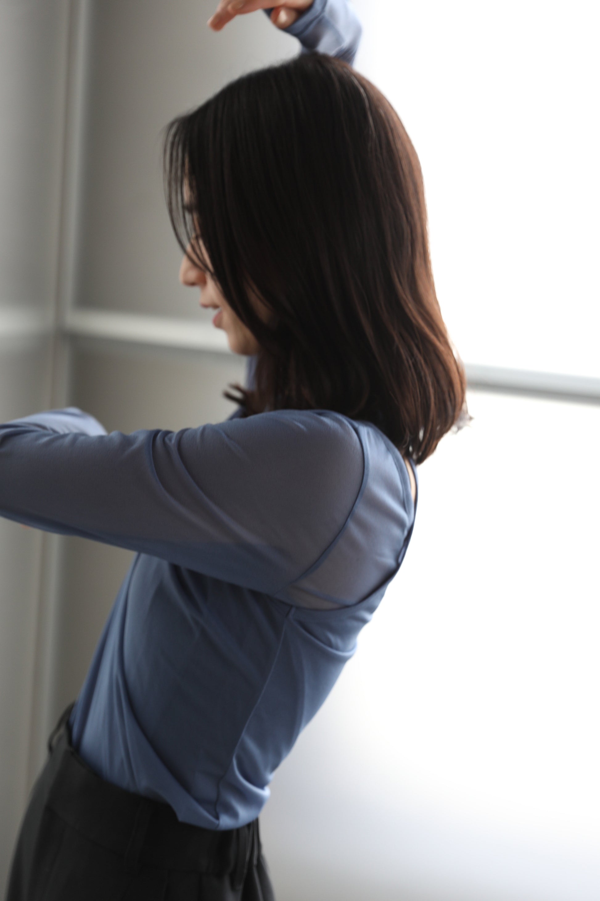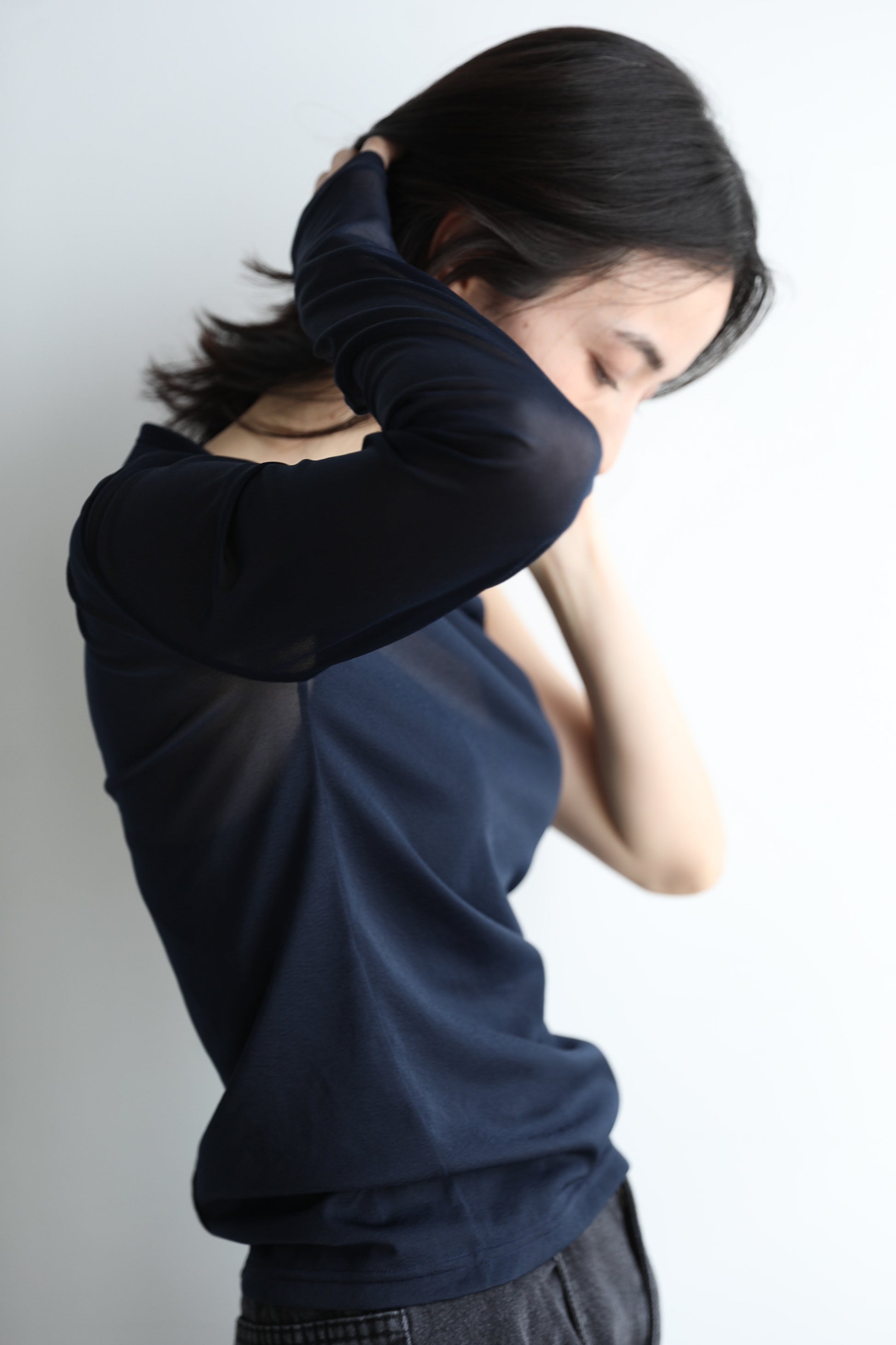 極細糸を使用したトリコット素材を採用。オーガンジーのように繊細でクリアな表面感がありながら、極細番手特有のなめらかでやわらかな肌触りが特徴です。