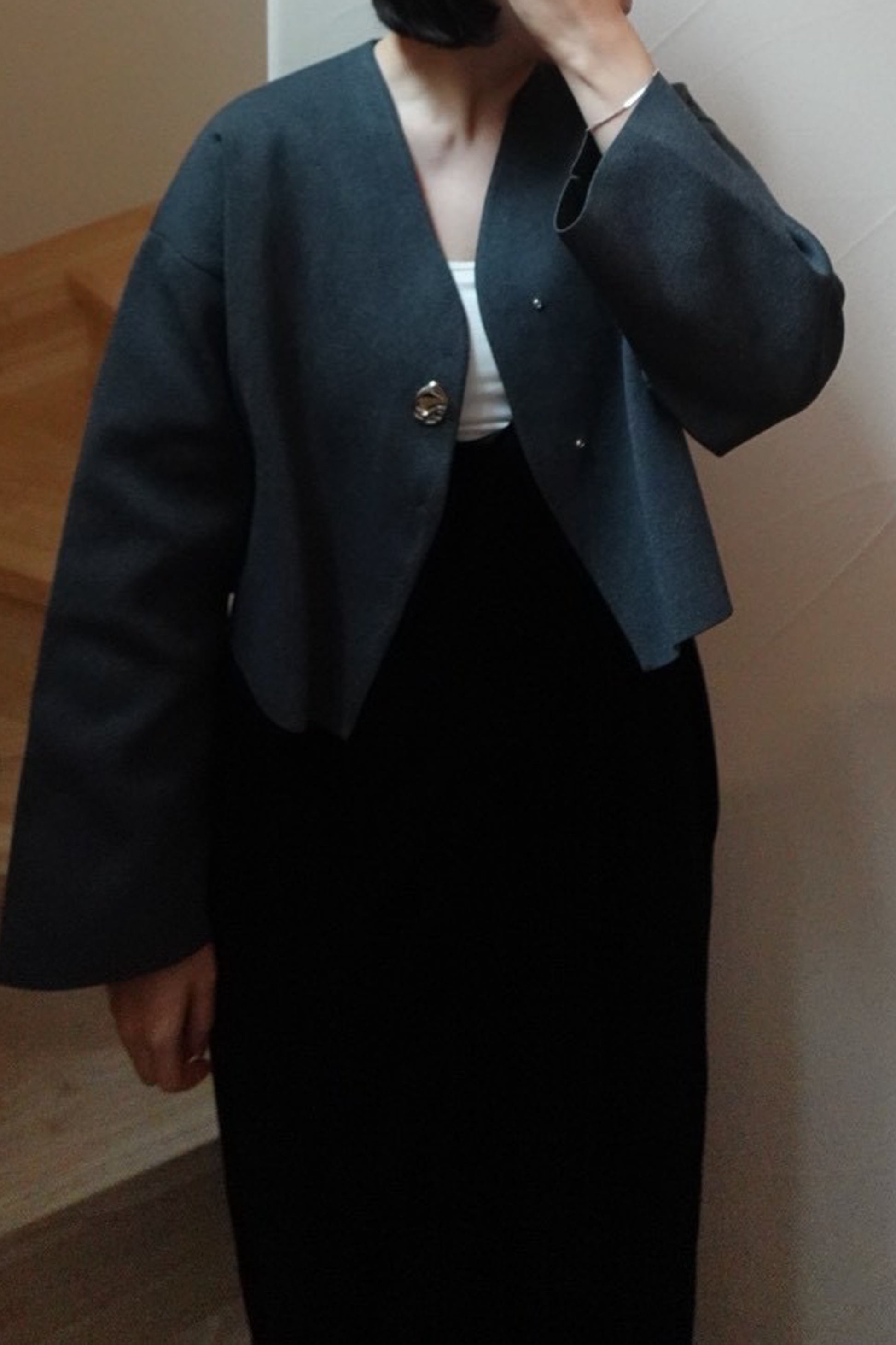 フロントには特殊ボタンをあしらい、纏うだけでスタイリングのアクセントに。