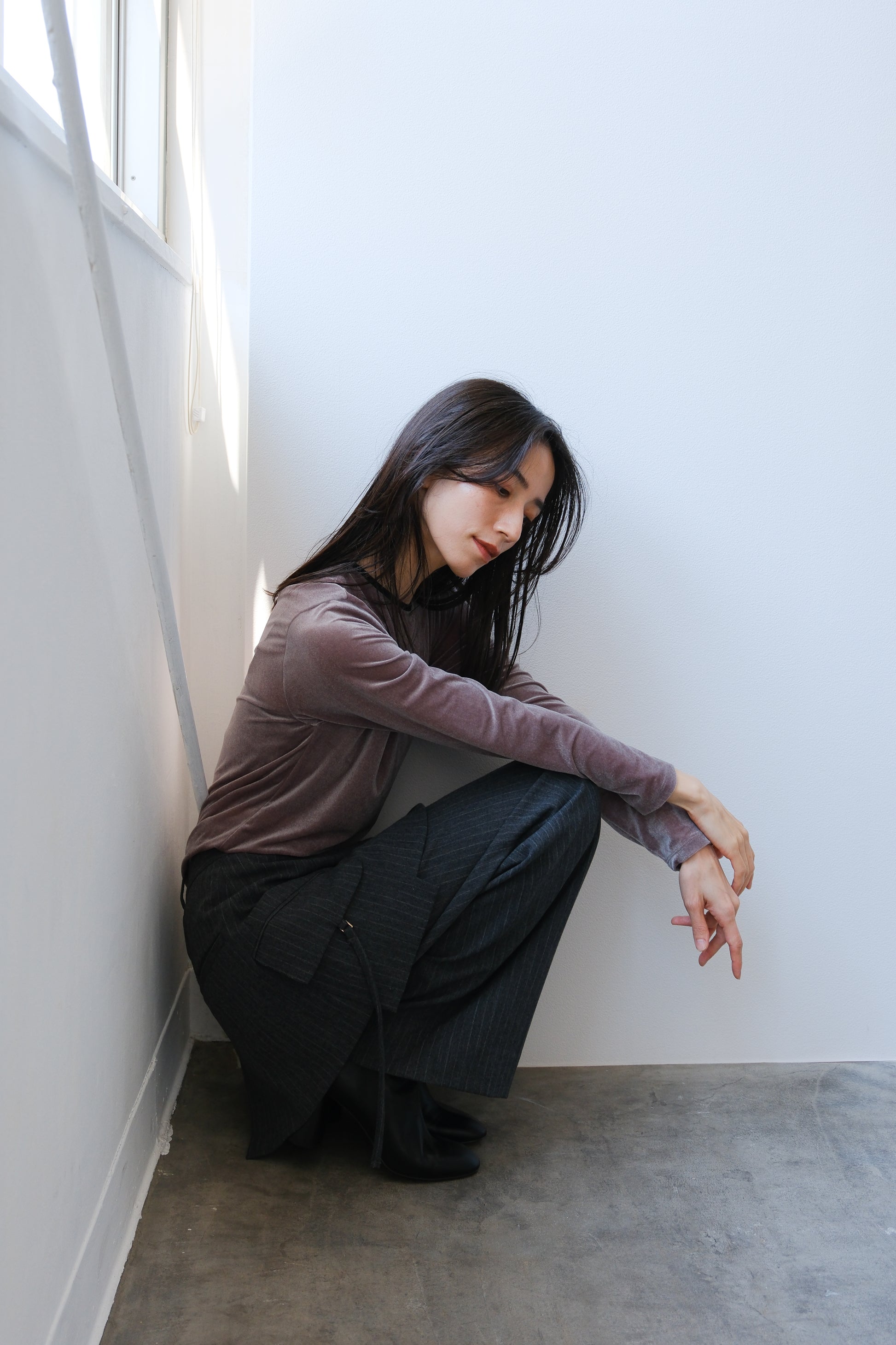 伸縮性があるため着心地がよく、軽やかさと程よい保温性も兼ね備えた素材です。上品なシアー感とベロアの起毛感が、抜け感と華やかさのある印象に。