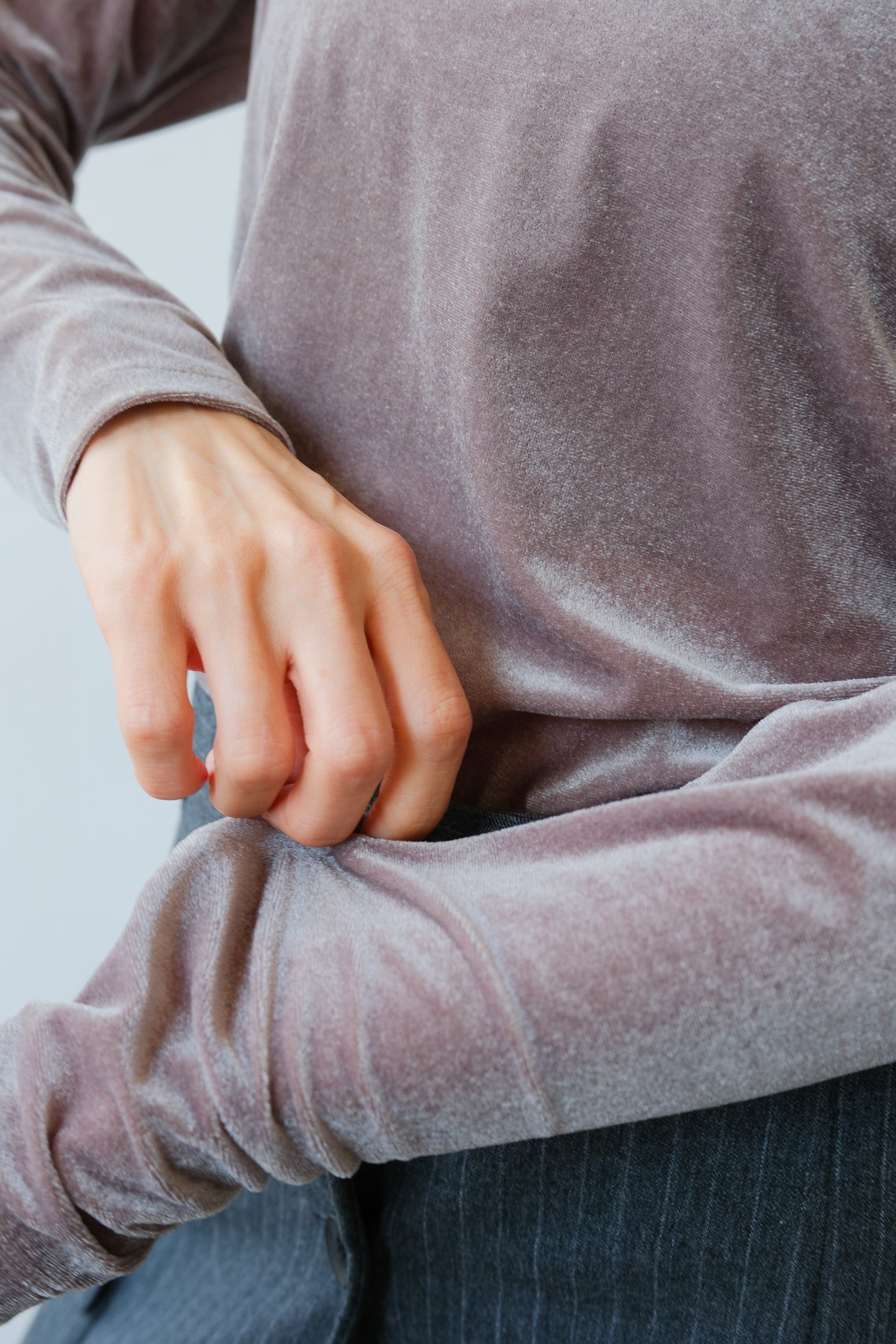 トレンドのシアーベロア素材を使用。光沢感と柔らかさを兼ね備え、肌に滑らかにフィットします。