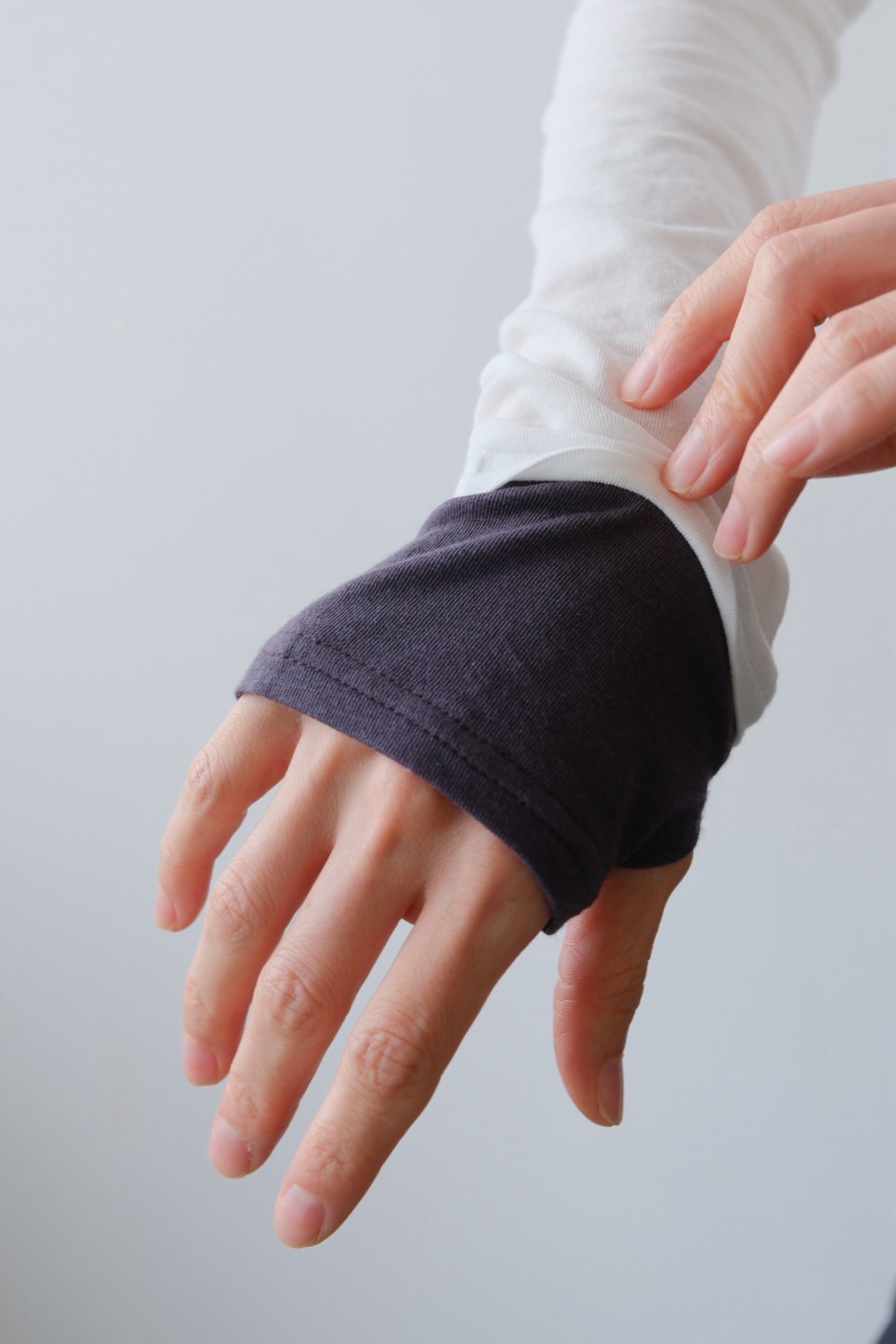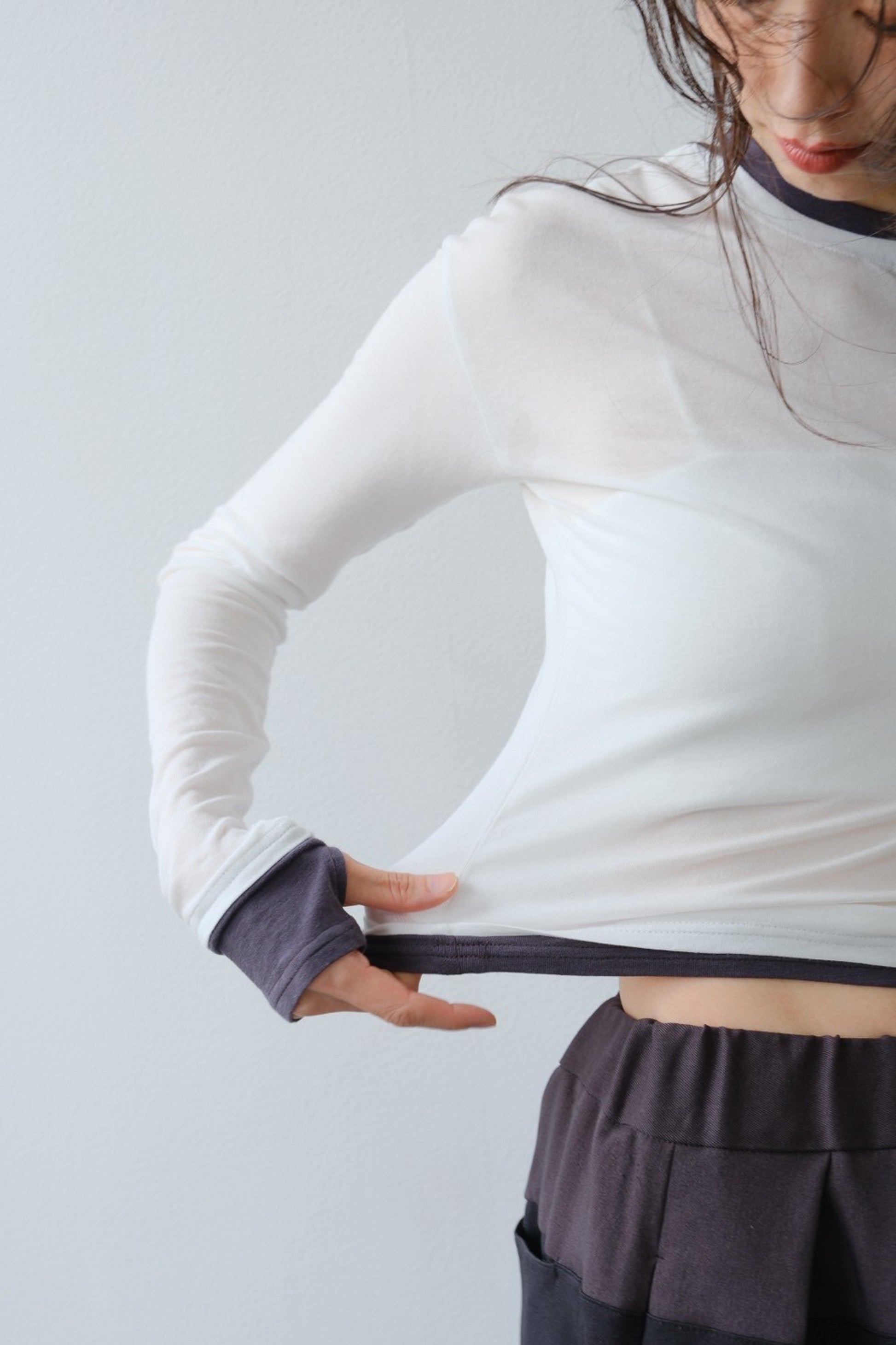 袖口と襟ぐりに異なるカラーを配したバイカラー風デザインのtops。